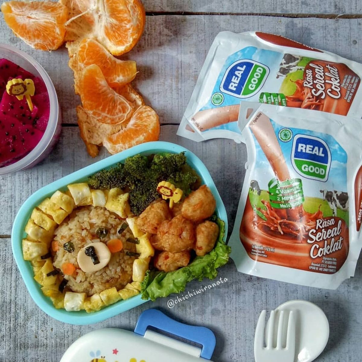 - Penyajian: Siapkan kotak bekal, letakkan nasi goreng, telur dadar, brokoli kukus, dan ayam popcorn. Lengkapi dengan susu sebagai minuman.