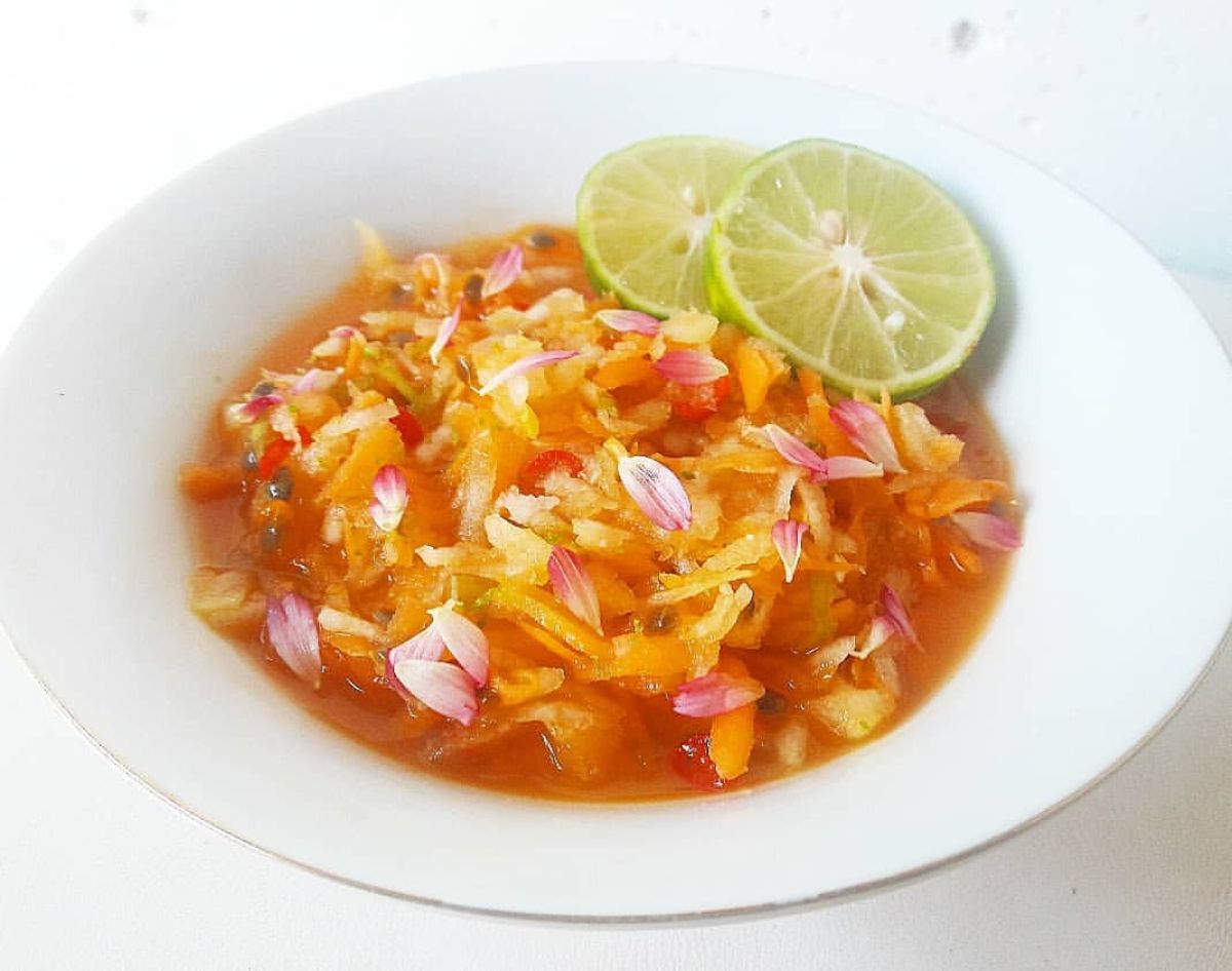 Tips: Salad ini menawarkan rasa yang unik, menggabungkan asam, manis, dan pedas mirip dengan rujak, sehingga memberikan pengalaman rasa yang menyegarkan. Di atas salad, Anda bisa menambah kelopak bunga kenikir yang tidak hanya mempercantik penampilan tetapi juga menambah kelezatan.