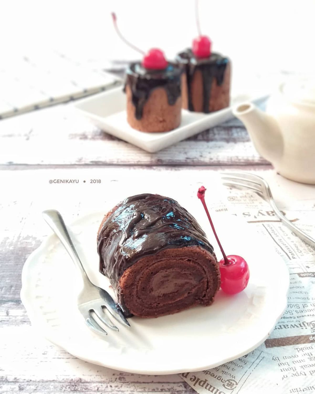 - Oleskan coklat leleh di atas permukaan kue, lalu gulung dengan hati-hati menggunakan kertas roti sebagai bantuan. Pastikan gulungan kue rapat agar tidak hancur.