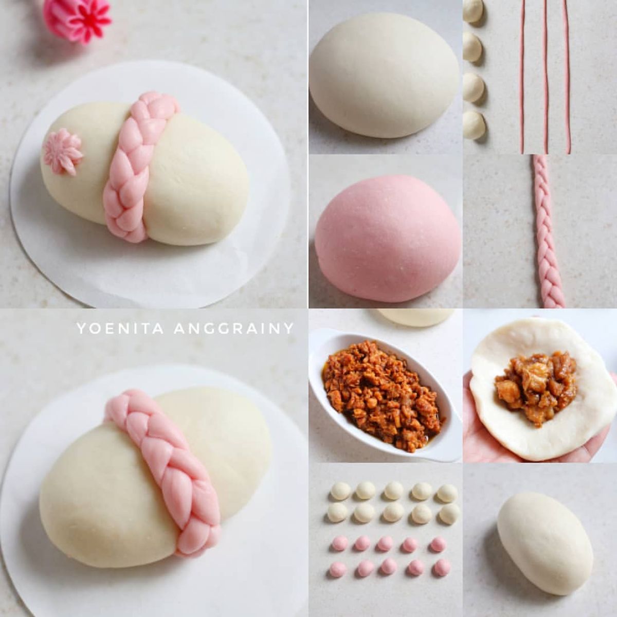 - Dari adonan merah muda, bentuk panjang-panjang dan kepang menjadi seperti tali. Kemudian, lilitkan kepangan ini di tengah pao putih yang telah dibentuk sebelumnya.