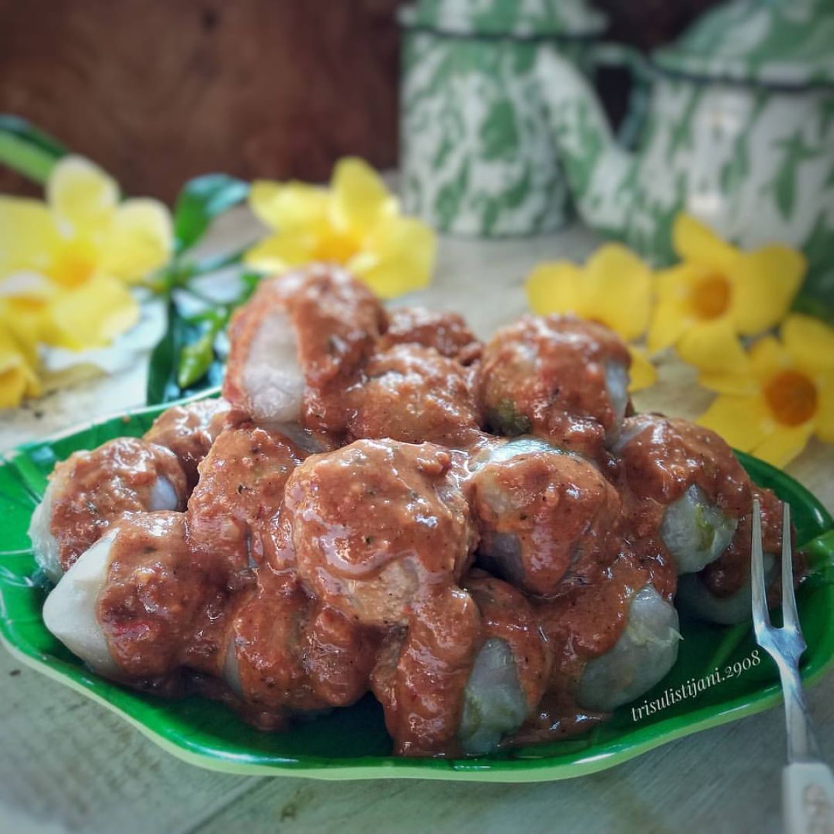 - Panas-panas, tuang air rebusan ke dalam campuran tepung. Aduk rata menggunakan sendok kayu hingga kalis dan bisa dipulung. Tes rasa untuk memastikan semua bumbu meresap.