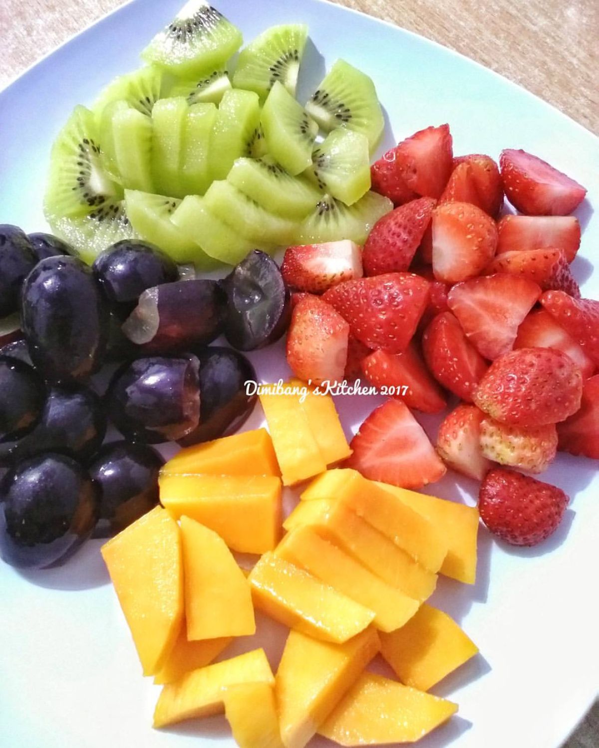- Potong buah. Iris apel, pisang, dan mangga menjadi ukuran kecil. Pisahkan anggur menjadi butir satu per satu.