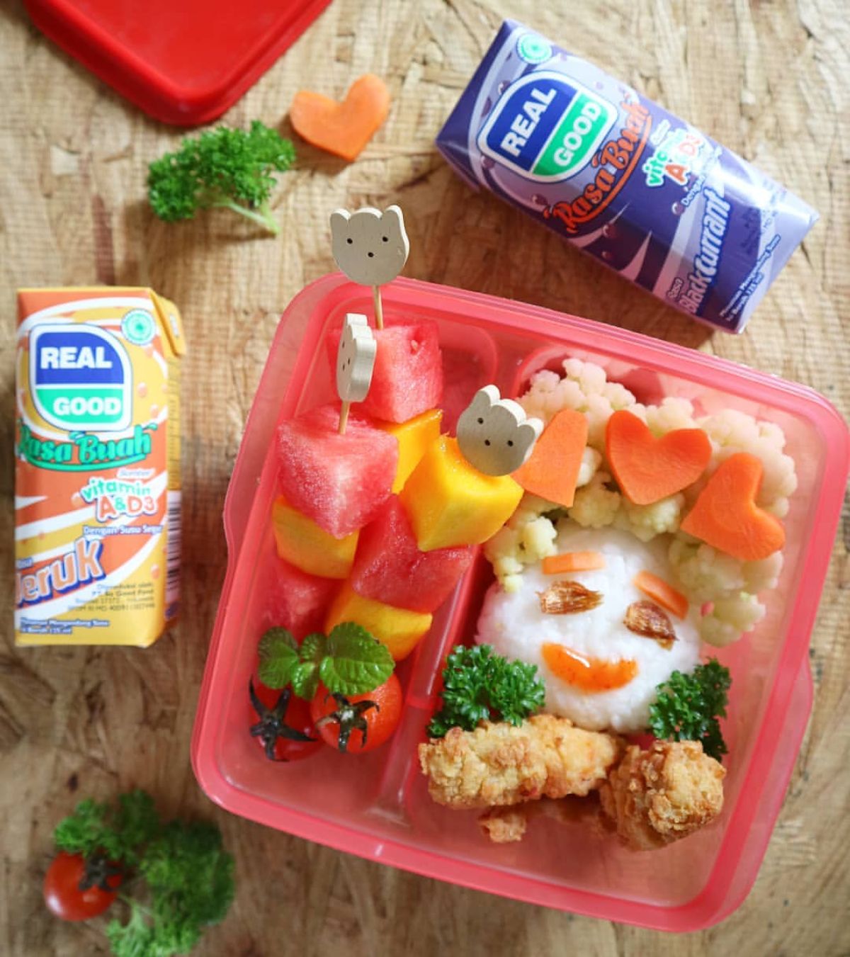 - Siapkan wadah bekal, susun sayur dan buah dengan cantik. Letakkan susu Real Good di sampingnya.