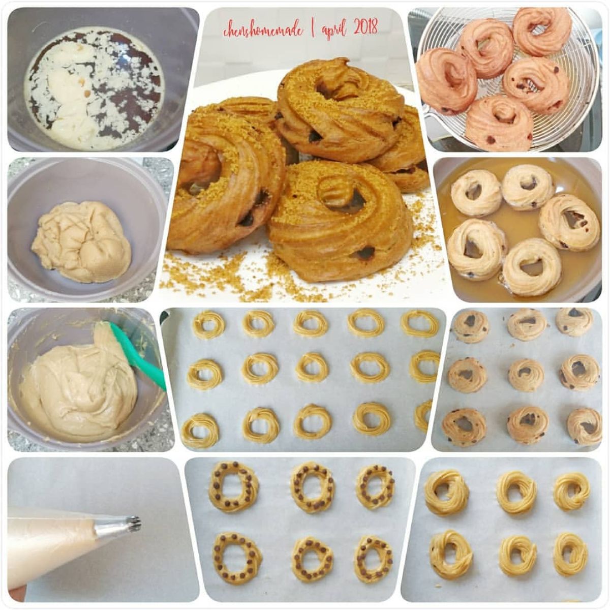 - Spuitkan adonan di atas loyang yang sudah dilapisi baking paper. Buat bentuk melingkar atau sesuai selera. Tambahkan isian cokelat chip atau Nutella di tengah, kemudian spuit lagi dengan adonan di bagian atasnya.