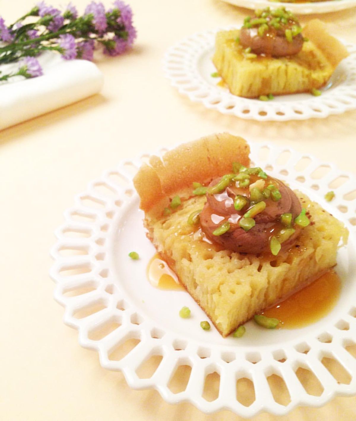 - Angkat martabak manis dari wajan, kemudian oleskan mentega di atasnya. Tambahkan topping sesuai selera, seperti Nutella, pistachio, dan dulce de leche.