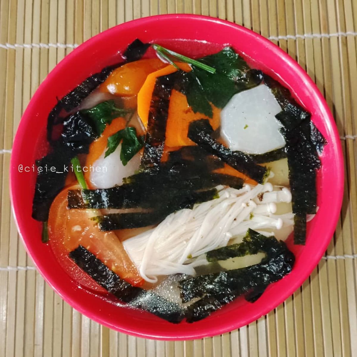 - Terakhir, taburi dengan rumput laut yang sudah dipotong. Sup siap disajikan panas-panas!