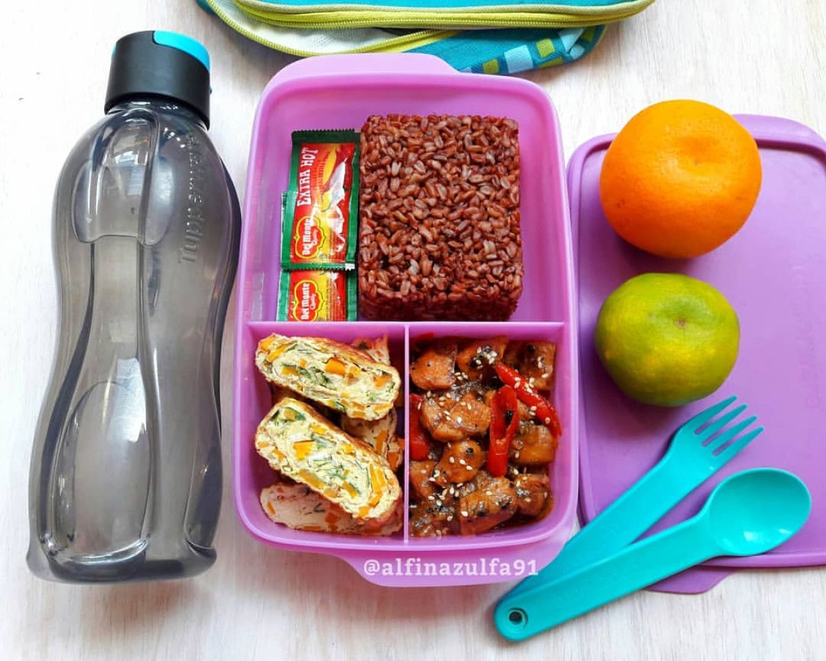 Resep ini cukup sederhana dan cocok untuk dibuat sebagai bekal. Dengan satu porsi ayam lada hitam, nasi merah, dan telur gulung, kamu mendapat sekitar 450 kalori. Ditambah dengan jeruk yang kaya vitamin C, memberikan daya tahan tubuhmu yang lebih baik.