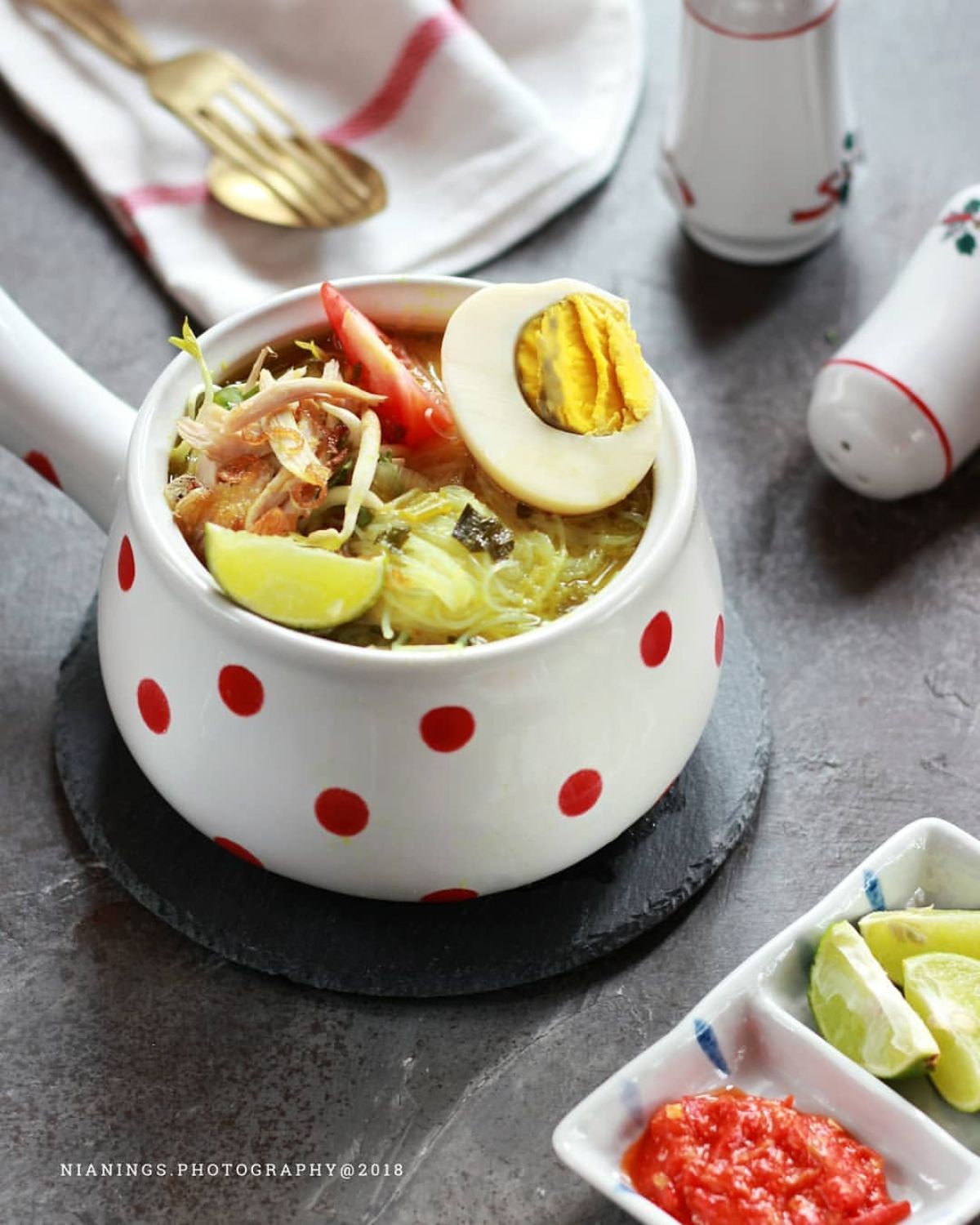 - Sajikan kuah soto bersama bahan pelengkap seperti soun, telur rebus, kol, seledri, daun bawang, tauge, dan tomat. Jangan lupa untuk menambahkan sambal dan perasan jeruk nipis untuk meningkatkan rasa!