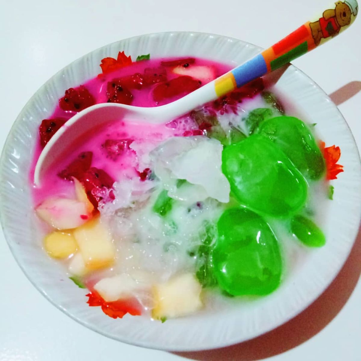 - Terakhir, tuang susu kental manis di atas campuran es dan buah. Aduk perlahan agar semua rasa tercampur.