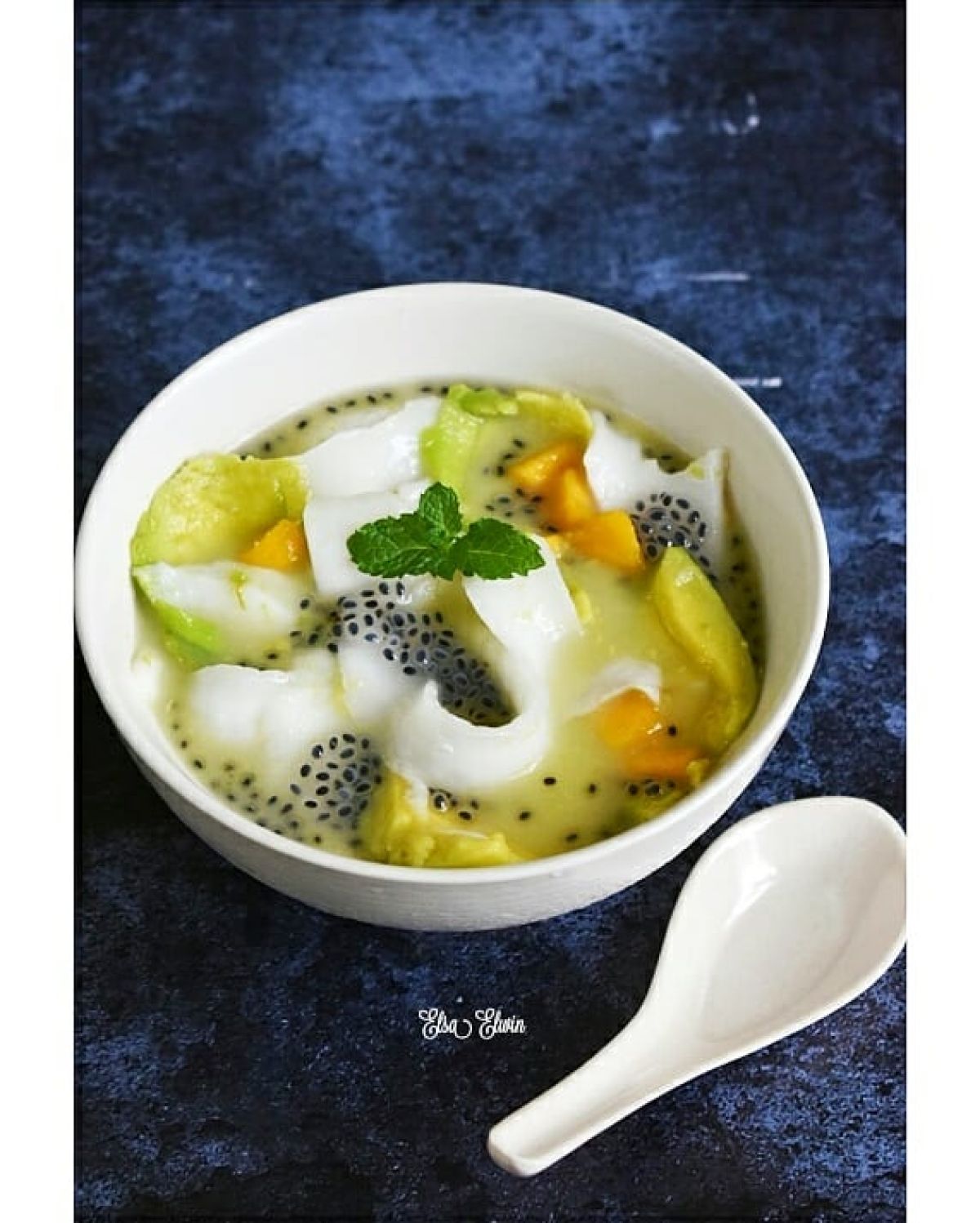 - Campurkan semua bahan ke dalam mangkuk besar: daging alpukat, daging kelapa muda, potongan mangga, dan biji selasih yang sudah direndam.