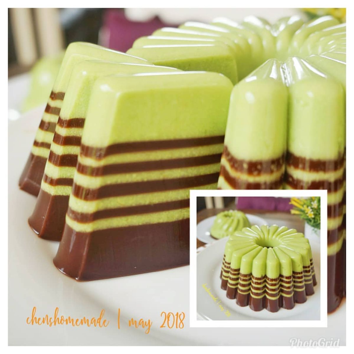 - Tuangkan puding pandan ke dalam loyang hingga setengah set, kemudian tuang puding coklat di atasnya.