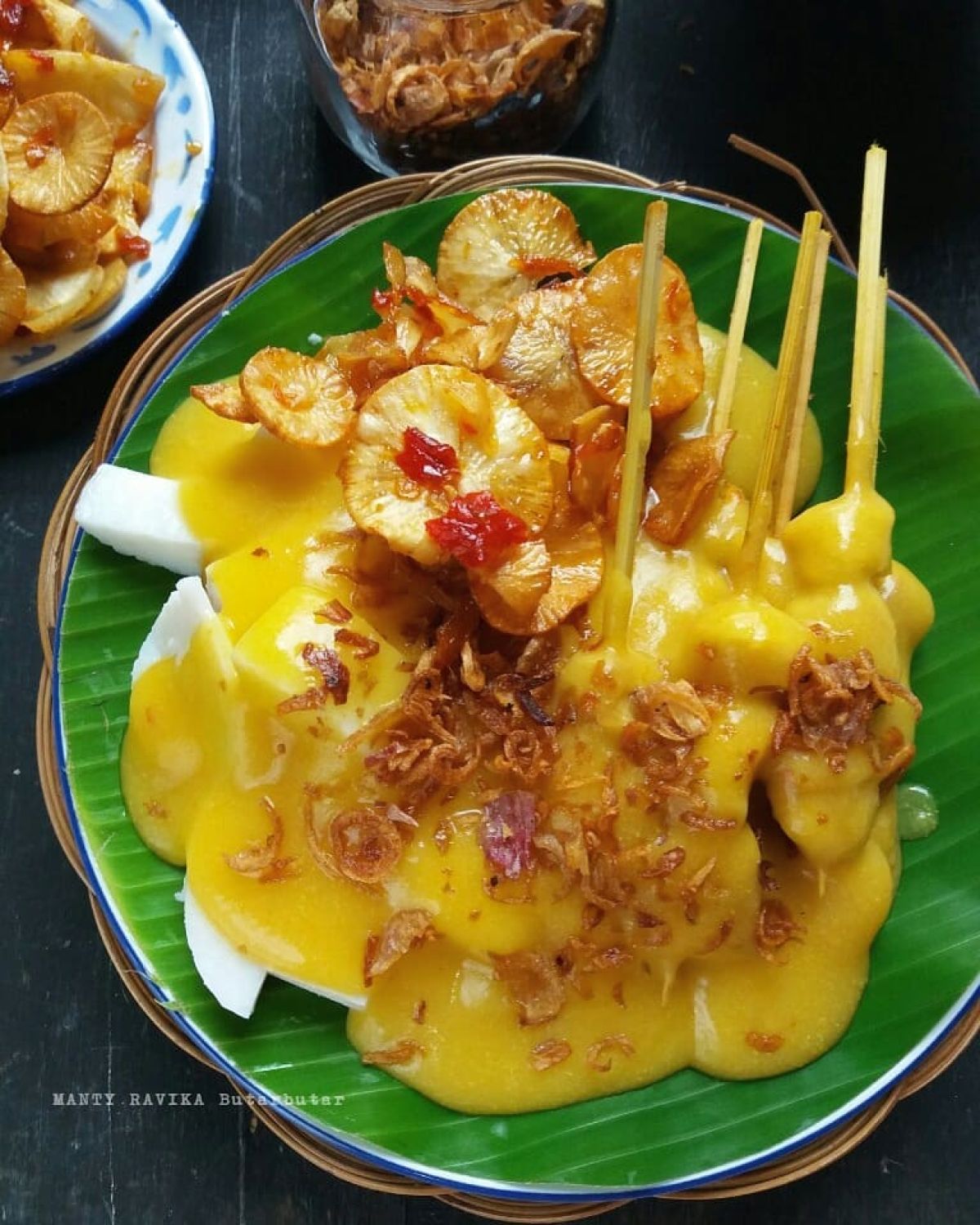 - Siapkan piring saji, letakkan potongan lontong, sate ayam yang sudah dibakar, lalu siram dengan kuah bumbu. Taburi bawang goreng di atasnya.