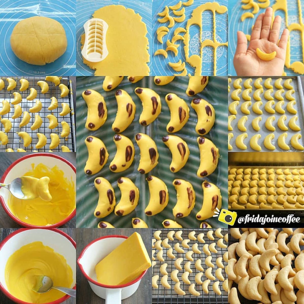 - Setelah 30 menit, keluarkan adonan dan cetak dengan cookie cutter berbentuk bulan sabit. Bentuk ujung dan sisinya agar tampak seperti pisang.