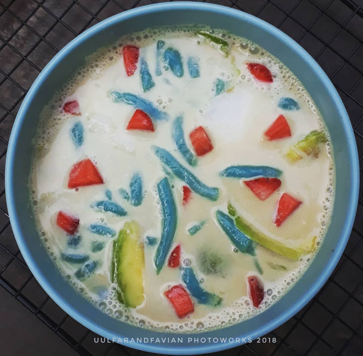 - Campurkan dawet yang sudah jadi dengan kuah, lalu tambahkan kelapa muda, alpukat, dan potongan strawberry sesuai selera.