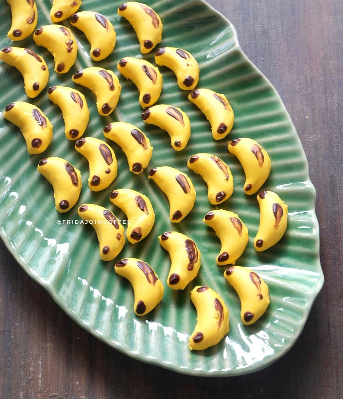 - Setelah didinginkan, cetak adonan menggunakan cookie cutter bentuk bulan sabit. Pastikan sisi-sisi kukis tidak terlalu tajam, agar menyerupai pisang.