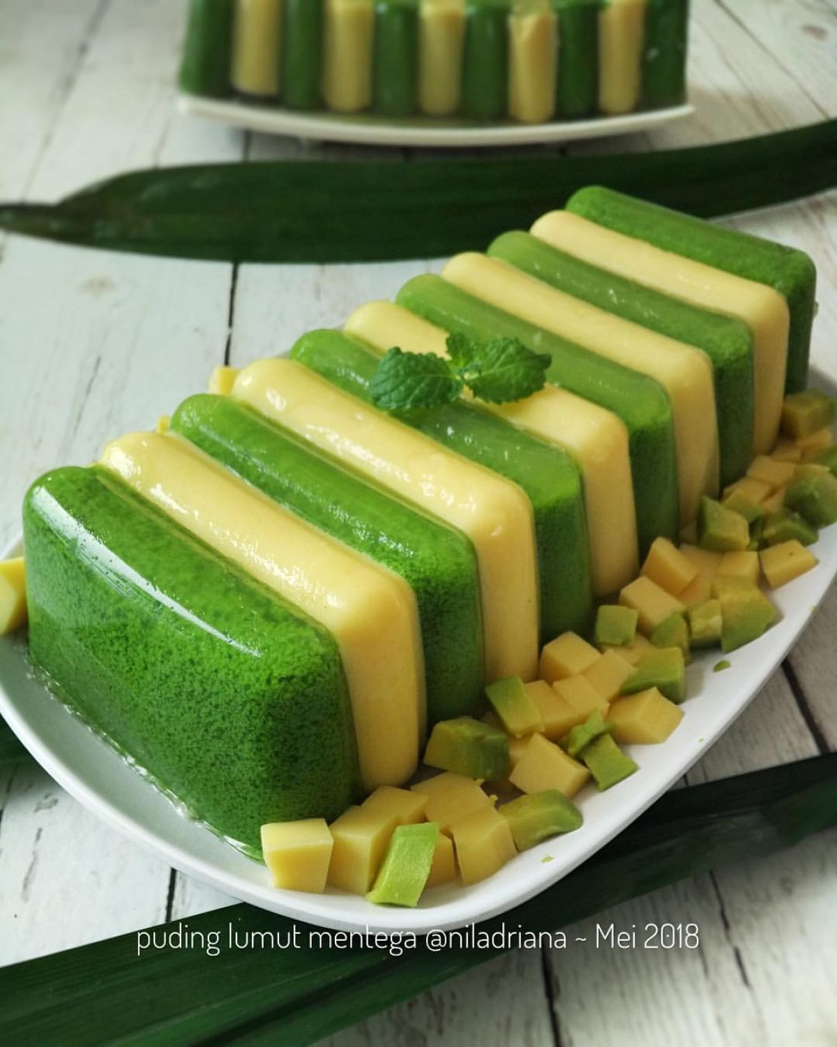 - Apabila ingin membuat bentuk yang lebih menarik, tuang masing-masing puding ke dalam loyang yang berbeda, tunggu hingga keras, kemudian potong dan susun selang-seling.