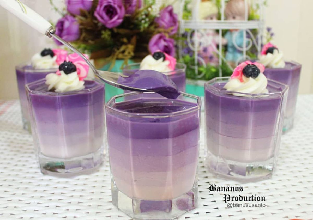 - Tambahkan lebih banyak bubuk taro pada sisa campuran puding hingga mendapatkan warna ungu yang lebih pekat untuk lapisan selanjutnya.