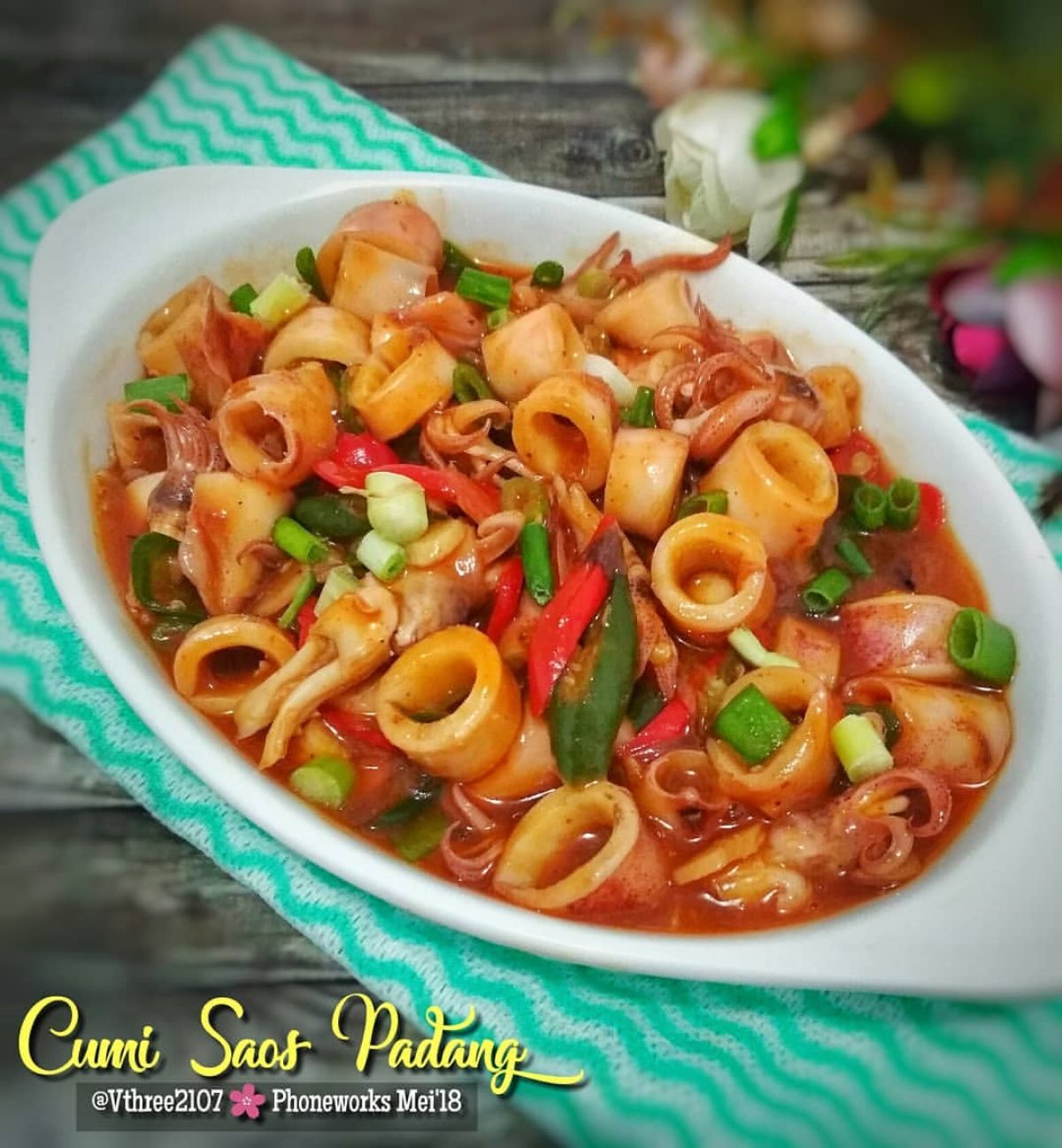 Cumi Saos Padang adalah salah satu masakan ikonik dari Indonesia, khususnya di daerah Sumatera. Hidangan ini terkenal dengan rasa pedas dan bumbunya yang kaya. Cumi-cumi yang digunakan adalah cumi asin, yang memberikan cita rasa unik. Santapan ini biasanya disajikan sebagai lauk pendamping nasi putih.