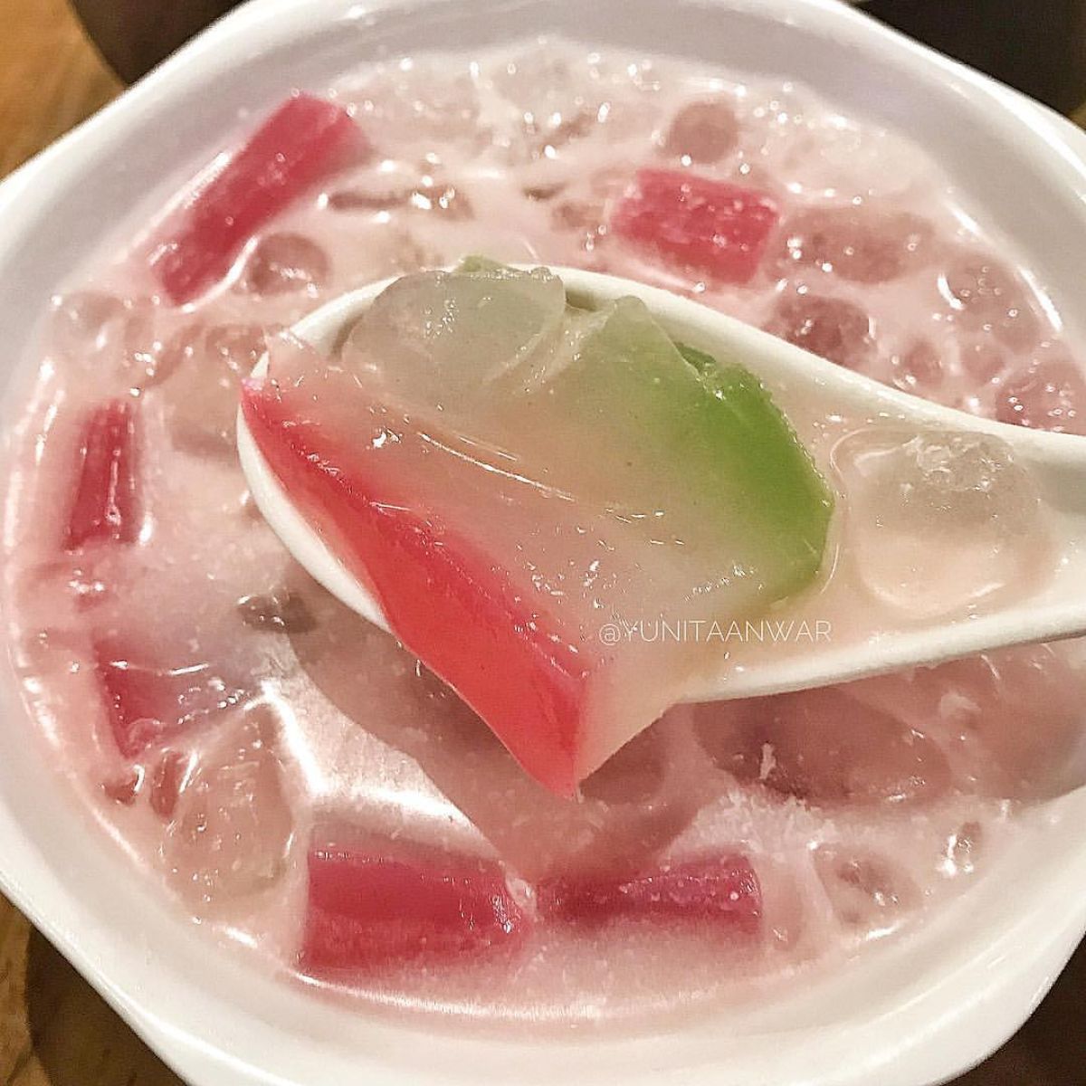 - Penyajian: Siapkan mangkuk saji, masukkan adonan yang telah dikukus, tambahkan es batu secukupnya, dan siram dengan santan gula merah di atasnya.