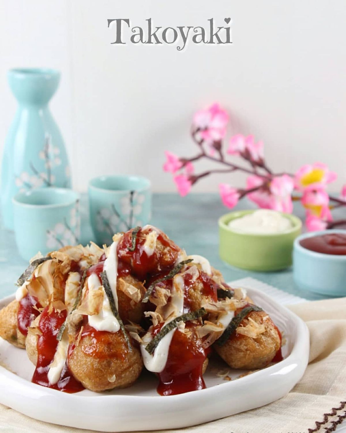 - Sajikan takoyaki hangat-hangat dengan saus, mayonnaise, taburan katsuobushi, dan nori di atasnya.