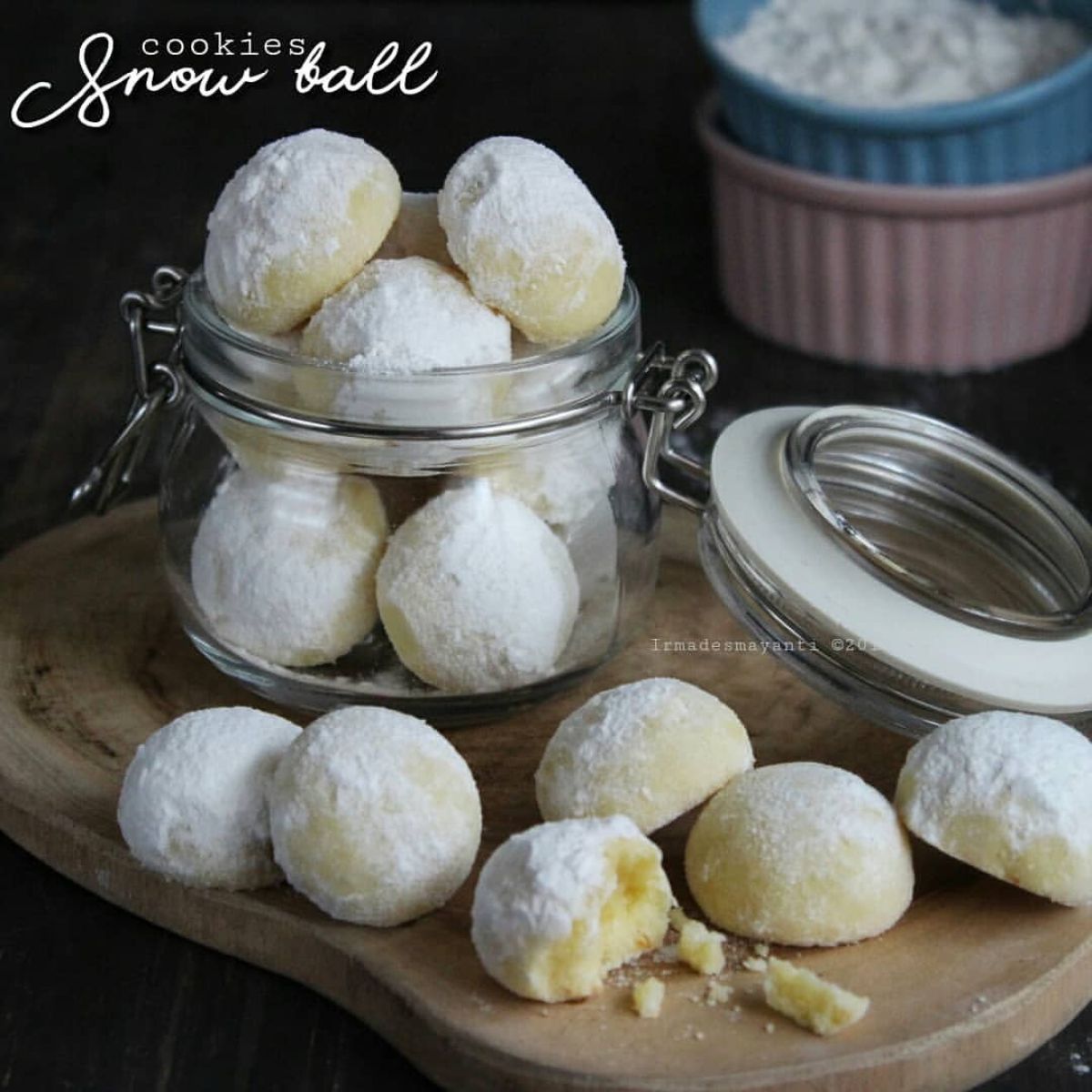 - Setelah kue benar-benar dingin, simpan dalam toples dan beri taburan gula halus dan susu bubuk di atasnya. Kue Putri Salju siap dinikmati!