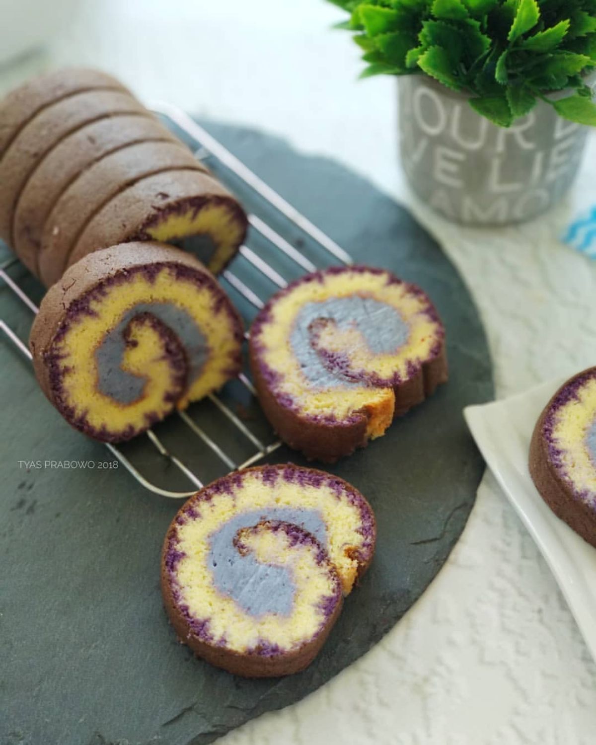 Saya mau berbagi resep kue yang enak dan menarik, yaitu Badai Topan Chiffon Swiss Roll. Kue ini memiliki kombinasi rasa yang unik dari bubuk taro dan tekstur yang lembut khas chiffon. Yuk, kita buat kue ini bersama!