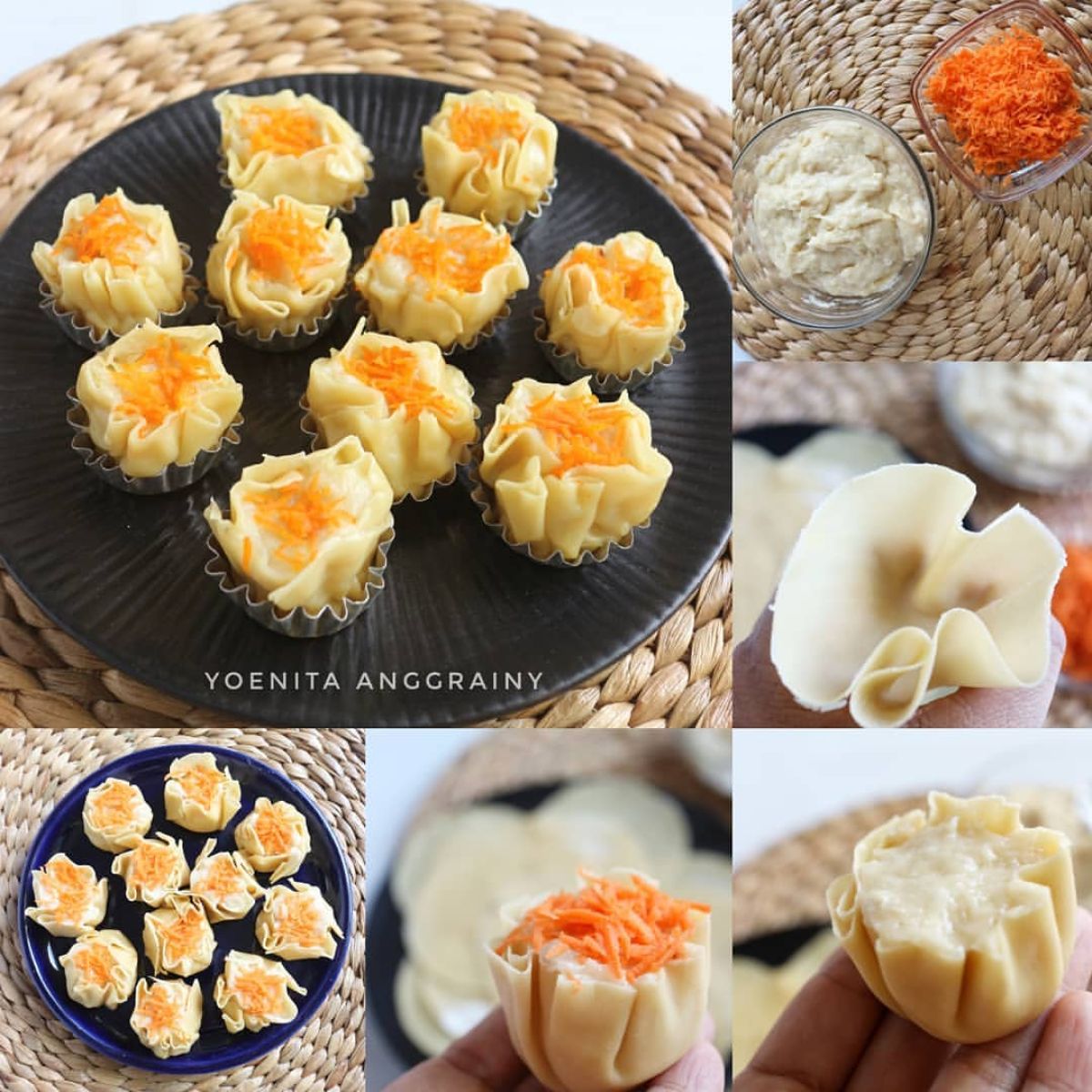 - Ambil selembar kulit siomay, lalu letakkan adonan siomay di bagian tengah kulit. Taburi permukaan adonan tersebut dengan wortel parut untuk memberikan tambahan rasa dan warna.