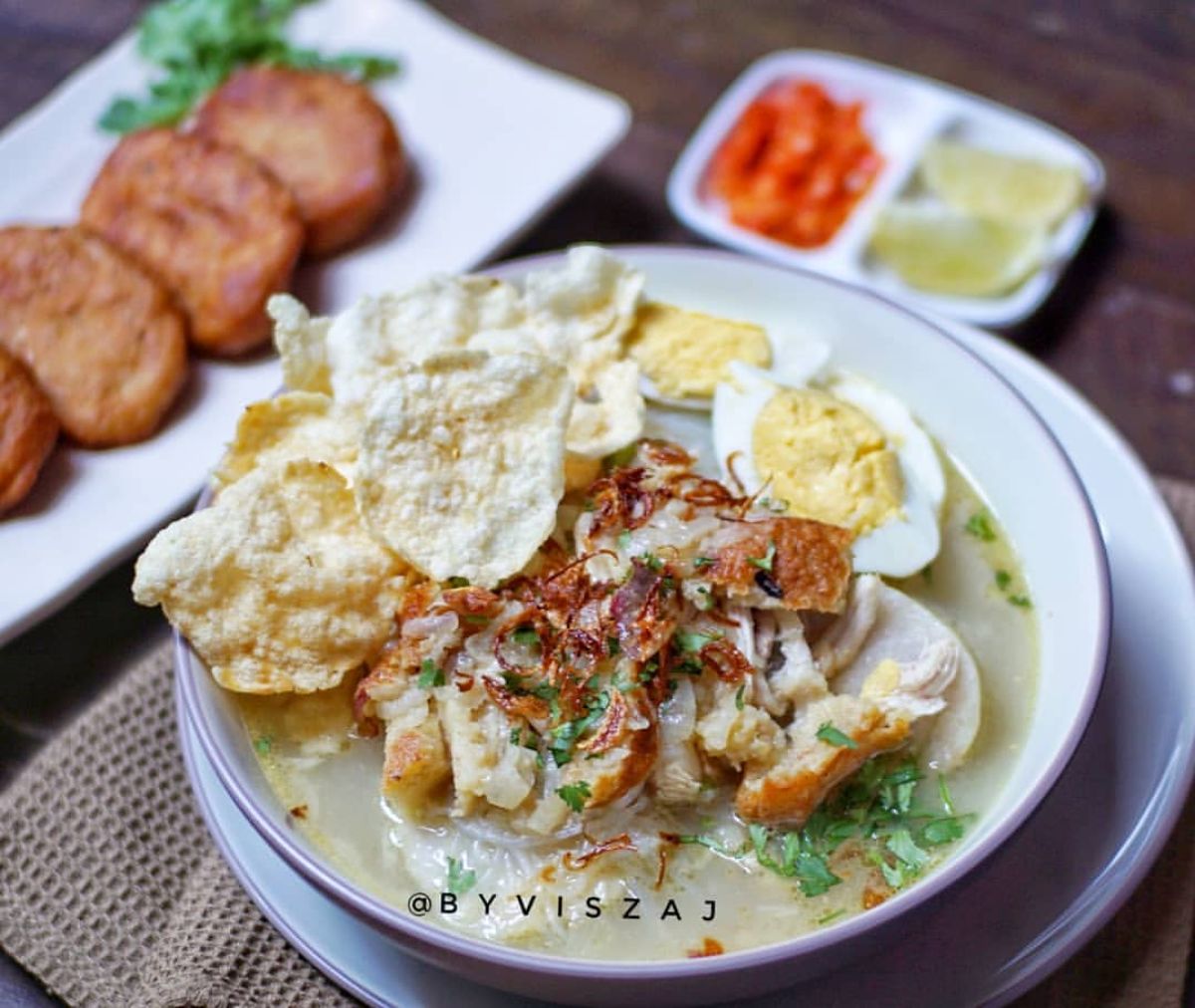 Tata lontong dalam mangkuk, tambah soun, suwiran ayam, potongan perkedel, dan telur rebus. Siram dengan kuah soto yang telah disiapkan. Jangan lupa tambahkan emping, bawang merah goreng, dan daun seledri untuk mempercantik tampilan!