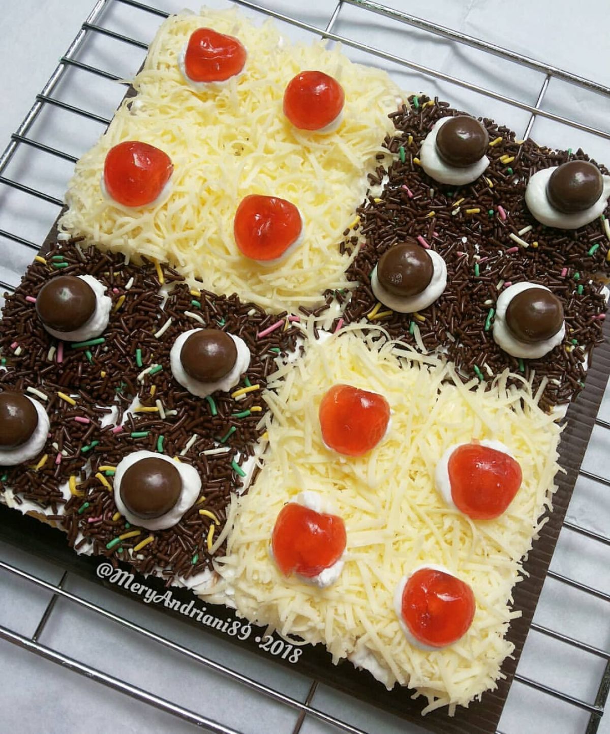 - Setelah matang, angkat kue dari oven dan biarkan di dalam loyang selama beberapa menit sebelum dilepas. Setelah dingin, oleskan buttercream di permukaan kue, lalu taburi dengan keju atau ceres sesuai selera kamu.