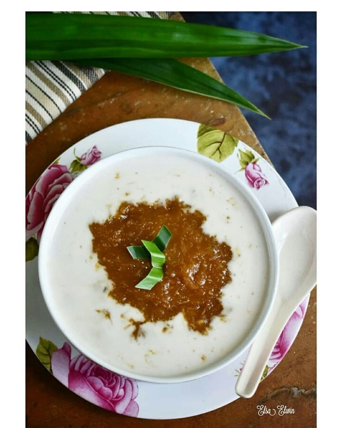- Setelah semua bahan siap, ambil mangkok atau piring saji. Isi dengan bubur singkong yang sudah matang, lalu siram dengan kuah santan kental yang telah dimasak.