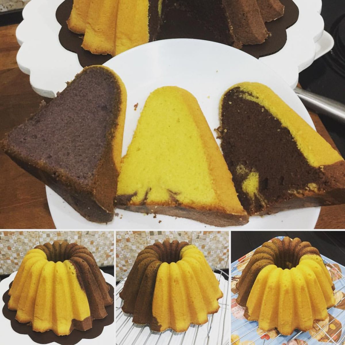 - Tuang semua adonan ke dalam loyang yang sudah disiapkan secara bergantian. Mulailah dengan adonan coklat, lalu taro, dan terakhir kuning.