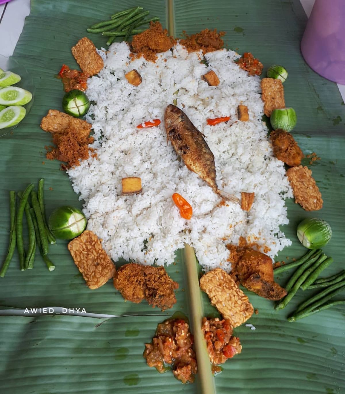 - Tempatkan ikan asin, ayam goreng, tempe goreng, sambal, dan lalapan di sekeliling nasi liwet. Nikmati bersama keluarga atau teman!