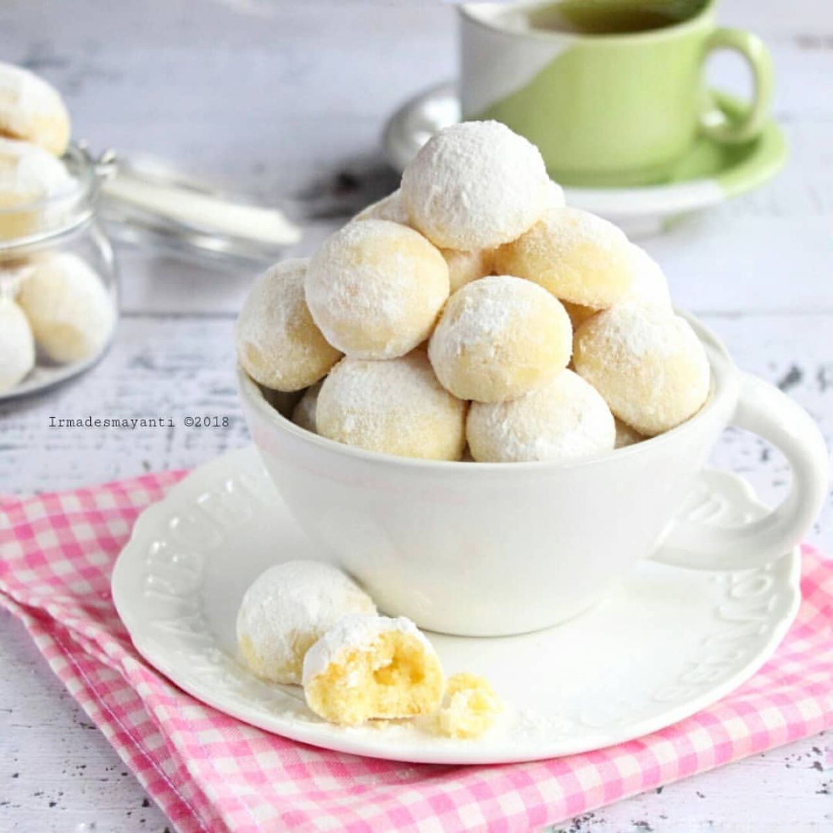 - Setelah benar-benar dingin, simpan kue dalam toples dan taburi lagi dengan gula halus dan susu bubuk agar tetap terlihat cantik.