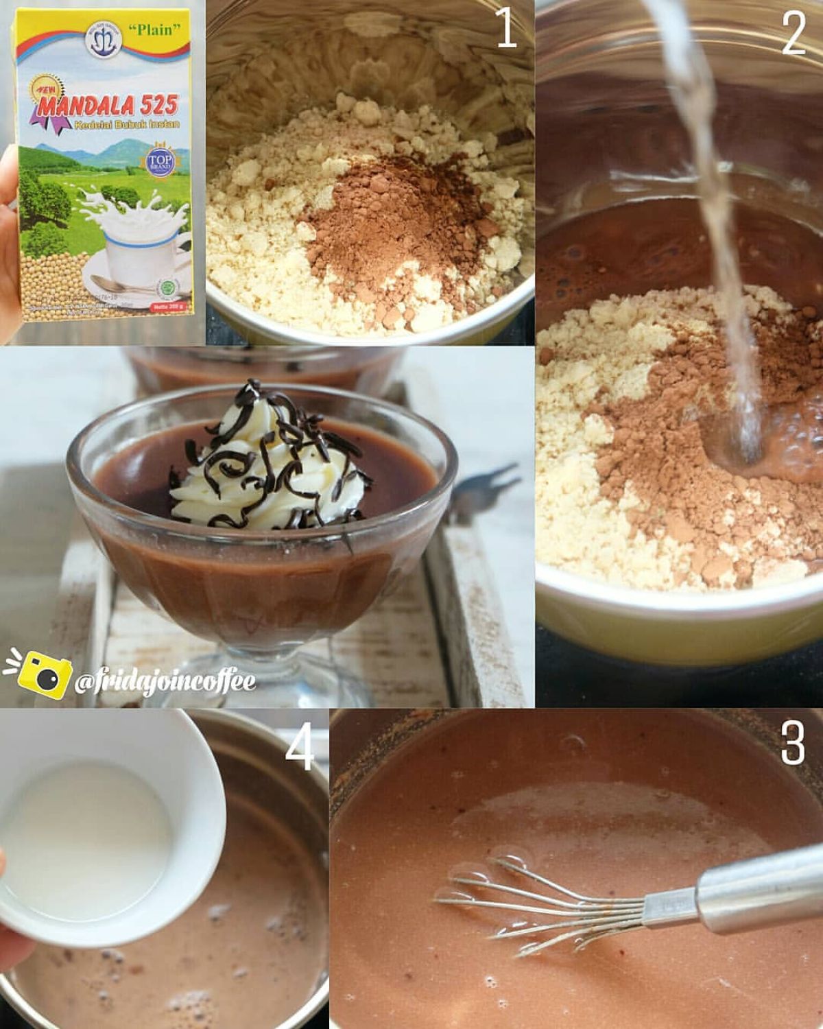 - Siapkan mangkuk besar, kemudian campurkan Susu Kedelai Bubuk, coklat bubuk, jelly bubuk, dan gula pasir. Aduk hingga semua bahan tercampur rata.