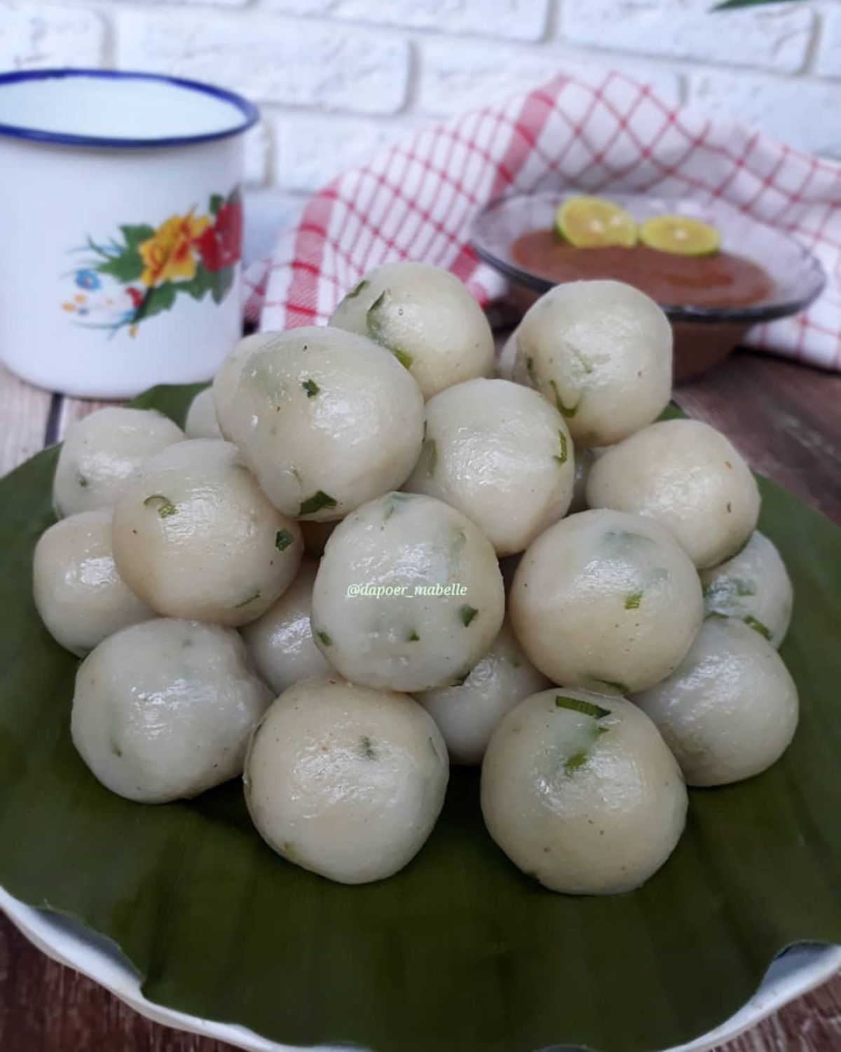 - Setelah campuran hangat, masukkan irisan daun bawang, kemudian tambahkan tepung tapioka sedikit demi sedikit. Aduk terus hingga semua bahan tercampur rata, lalu bulat-bulatkan adonan cilok tersebut.