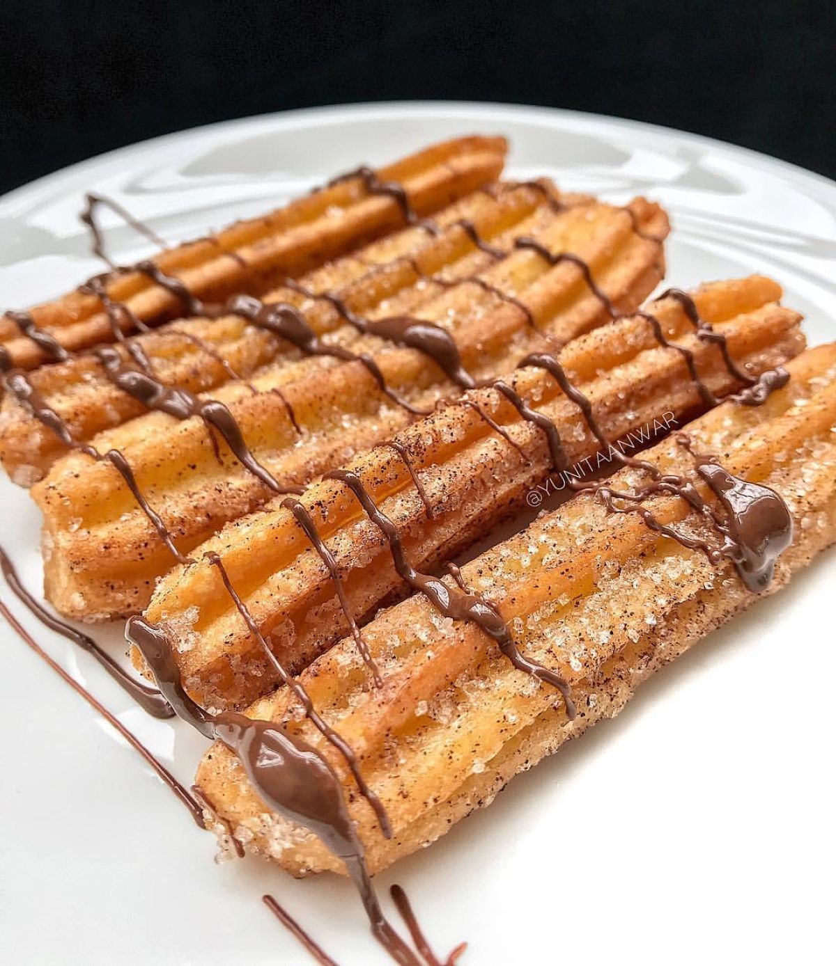 Taburi churros dengan gula halus dan sajikan dengan saus coklat di sampingnya untuk dicelup. Nikmati churros yang garing di luar dan lembut di dalam bersama saus coklat yang manis. Ini adalah sarapan yang pasti digemari semua orang!