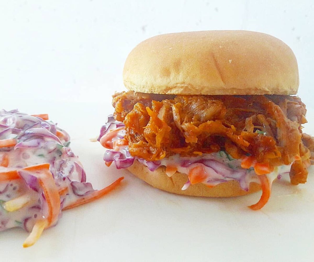 - Hangatkan roti bun, beri coleslaw di dalamnya kemudian letakkan daging nangka di atas coleslaw. Sandwich siap disajikan!