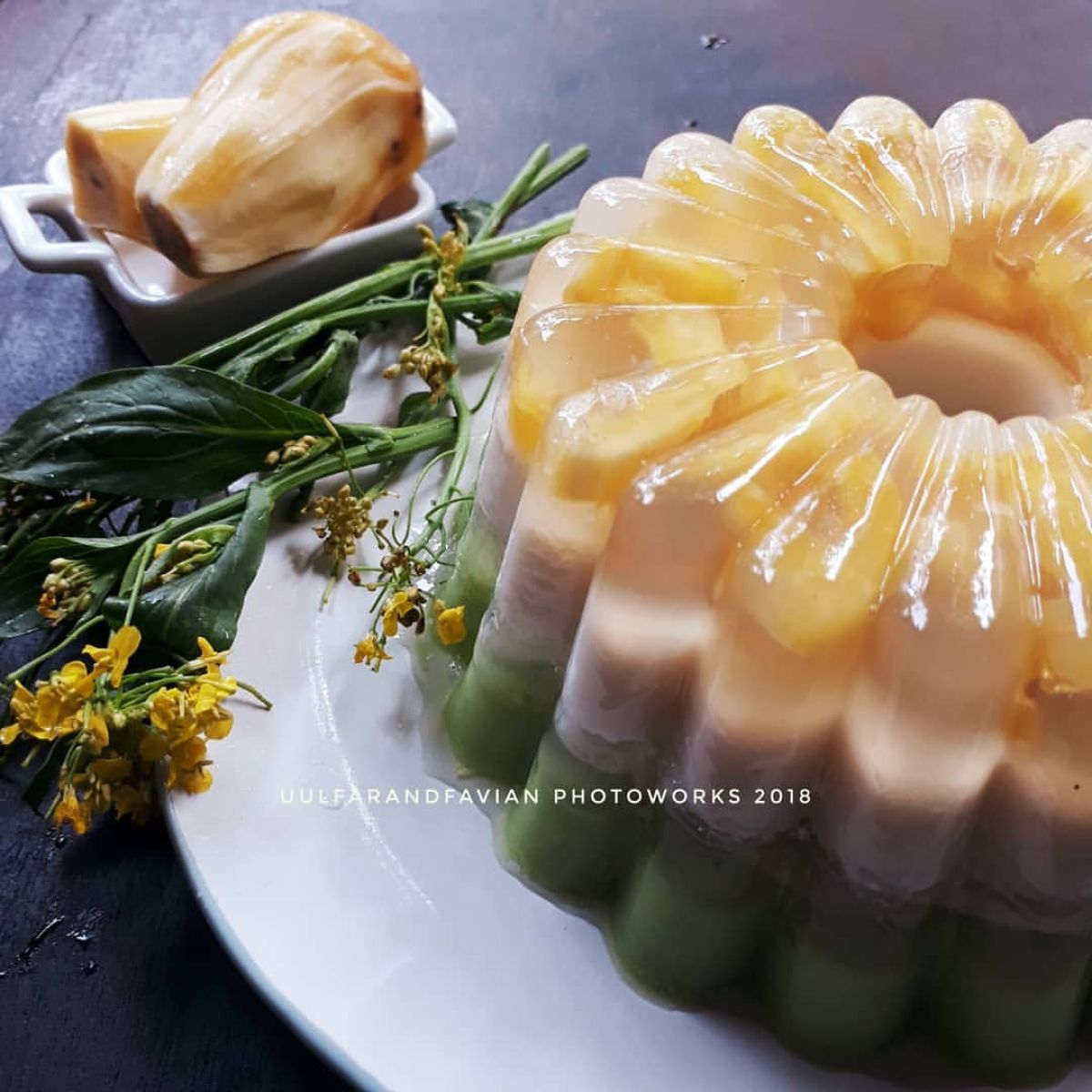 - Saat puding sudah mengeras, keluarkan dari cetakan. Sajikan dengan potongan nangka, alpukat, dan kelapa muda di atasnya.