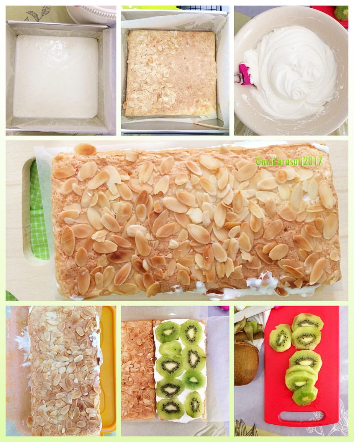 - Kocok whipping cream sampai kaku. Belah kue menjadi dua bagian yang sama besar. Oleskan whipped cream pada salah satu bagian, susun potongan buah kiwi di atasnya, lalu tumpuk dengan bagian kue lainnya.