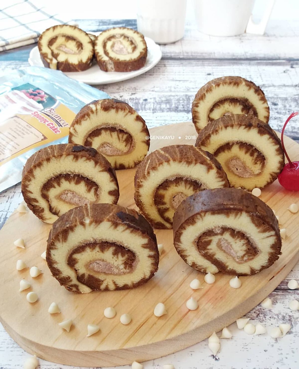 - Setelah matang, angkat dan dinginkan. Oleskan permukaan kue dengan whip cream, lalu gulung dengan hati-hati dan potong-potong sesuai selera.