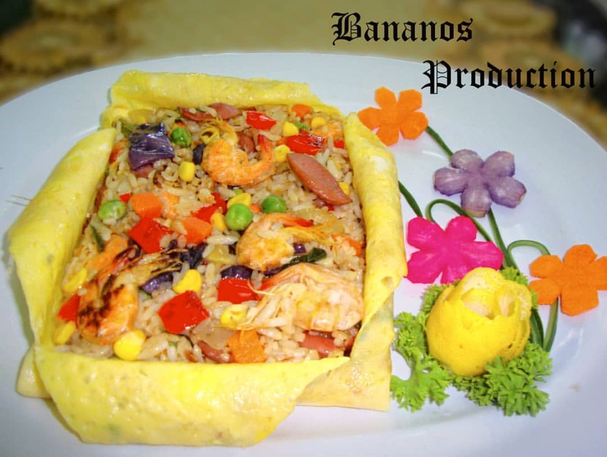 - Untuk menyajikan, tempatkan nasi goreng di atas telur dadar, kemudian lipat keempat sisi telur dadar untuk membalut nasi goreng, dan sajikan panas-panas.
