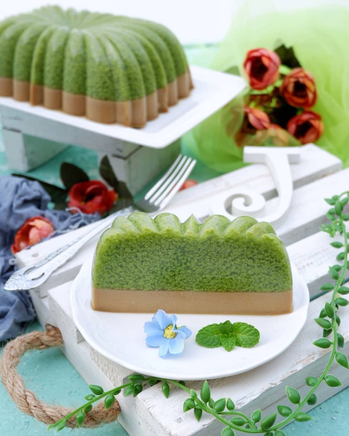 - Tuang perlahan ke atas pudding lumut yang sudah hampir setengah beku.