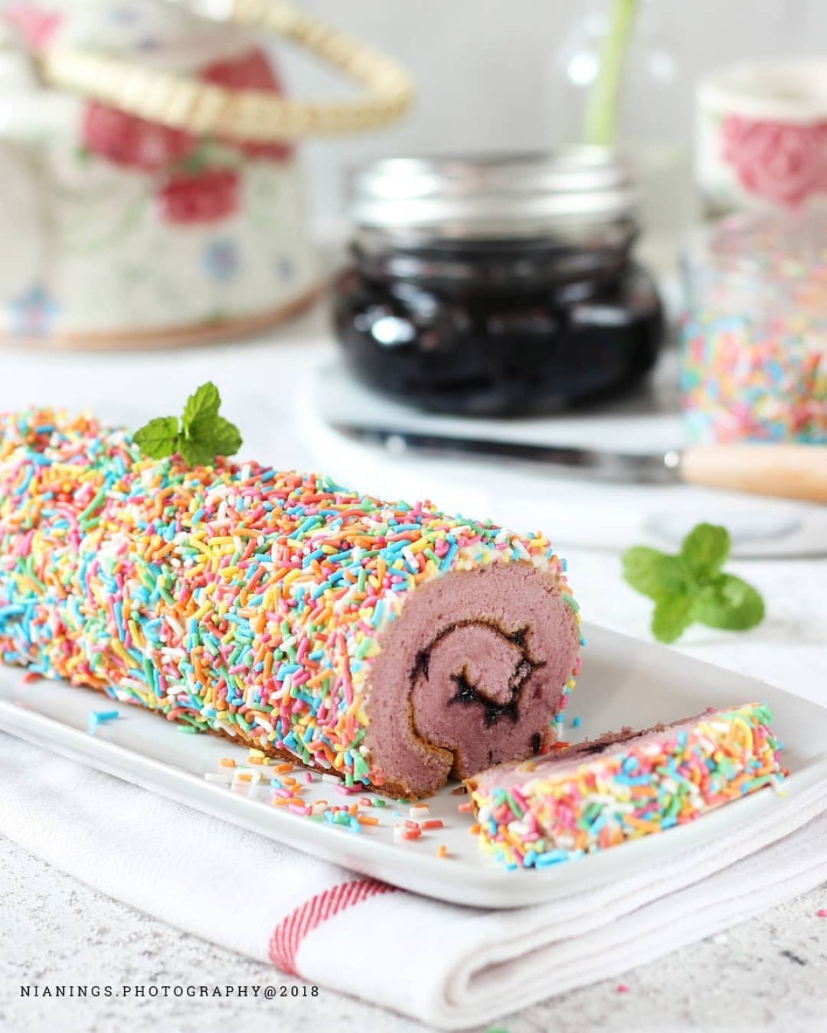 - Terakhir, oleskan buttercream di atasnya dan hiasi dengan meises warna-warni. Bolu Gulung Taro siap dinikmati!