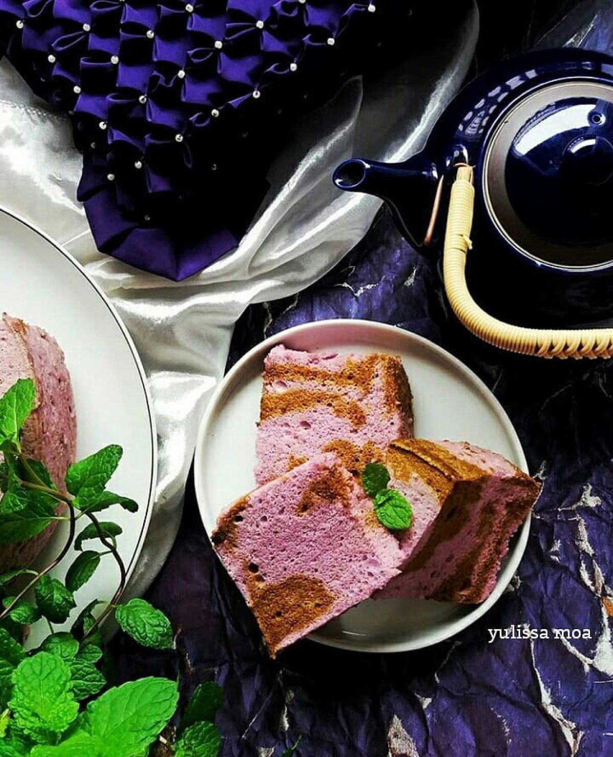 - Tuang adonan secara selang-seling ke dalam loyang chiffon yang tidak dioles apa-apa. Ini akan memberikan efek belang yang cantik pada kue kita.