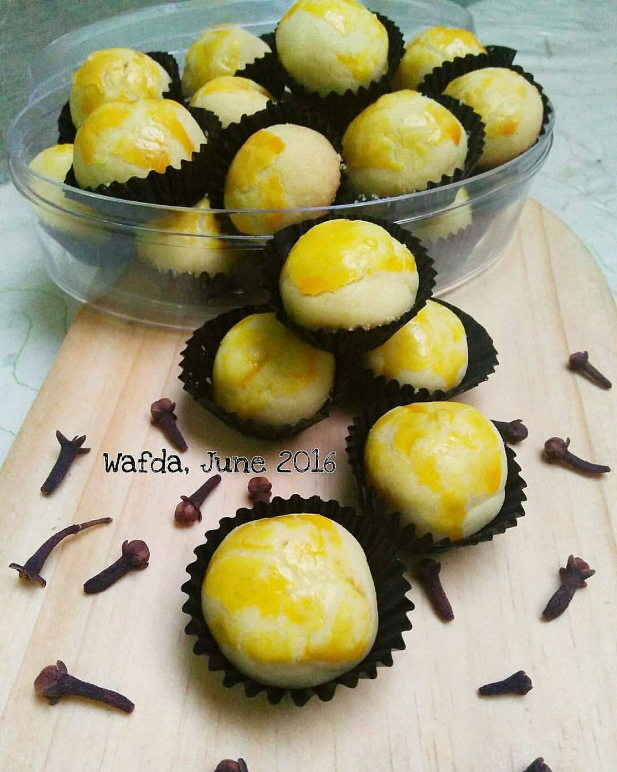 - Siapkan loyang yang telah dialasi kertas roti dan diolesi margarin. Letakkan bola-bola nastar di atas loyang.