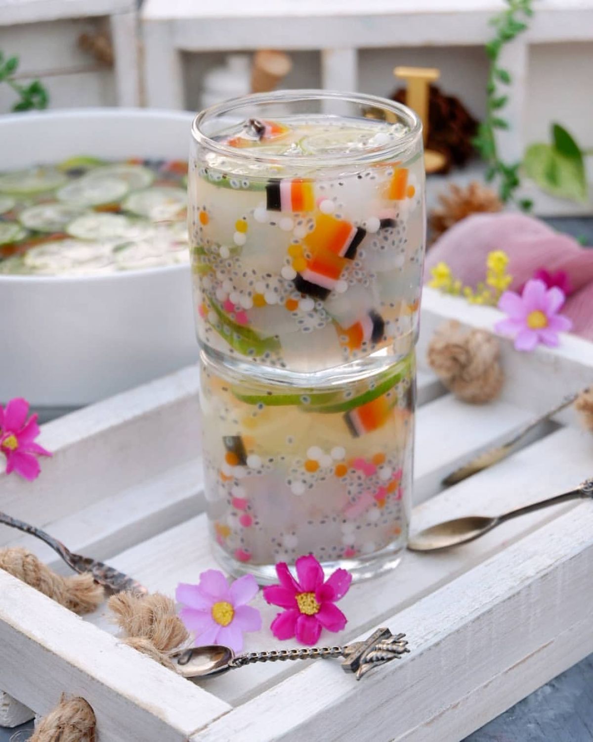 - Campur semua bahan isi (jelly, selasih, timun, sari kelapa, longan, dan irisan jeruk nipis) dalam sebuah wadah. Aduk hingga semua bahan tercampur rata.