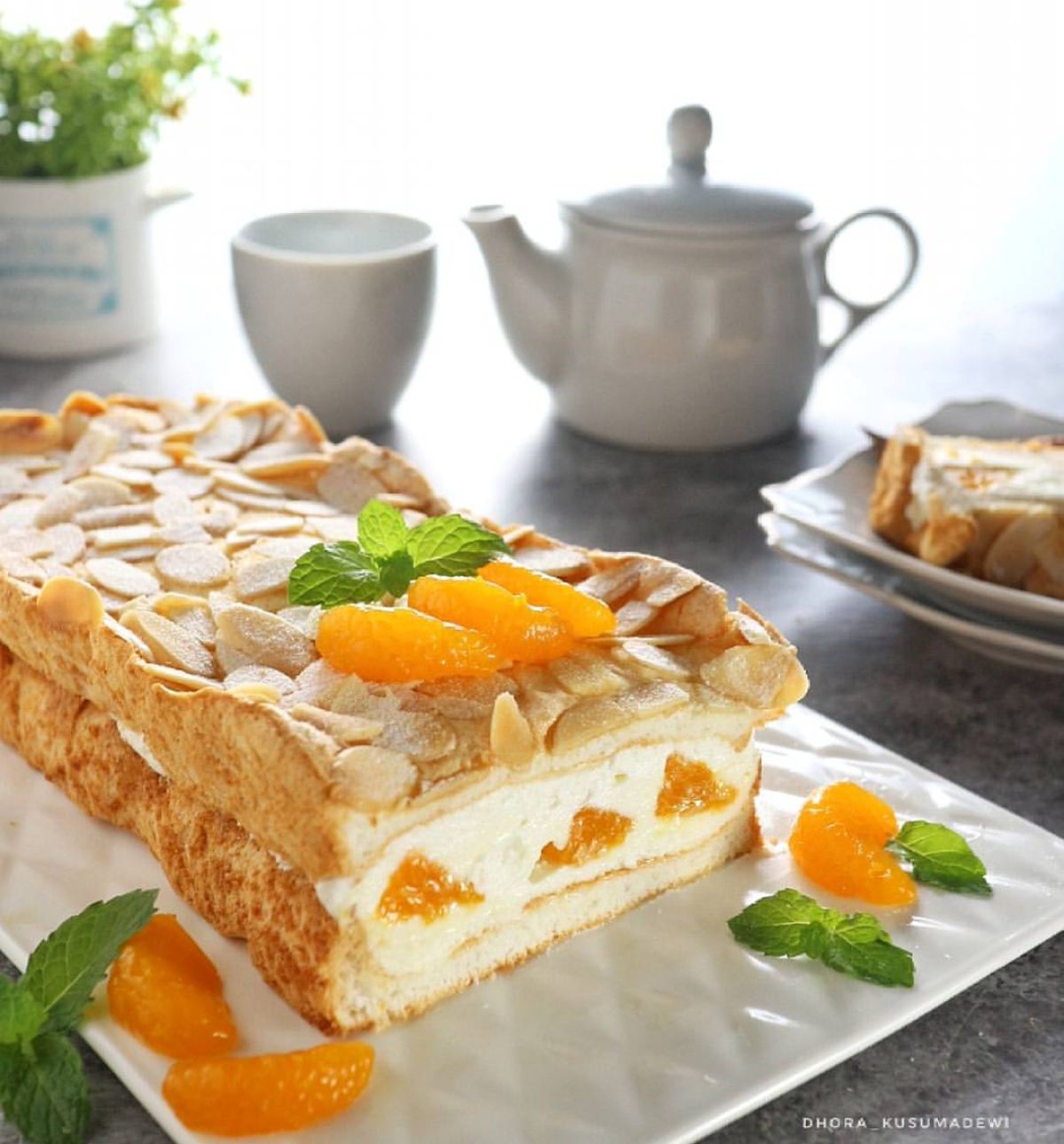 - Oleskan whip cream pada cake yang tidak ada almondnya. Tata jeruk mandarin di atasnya, kemudian oleskan whip cream lagi dan tumpuk dengan cake yang satunya.