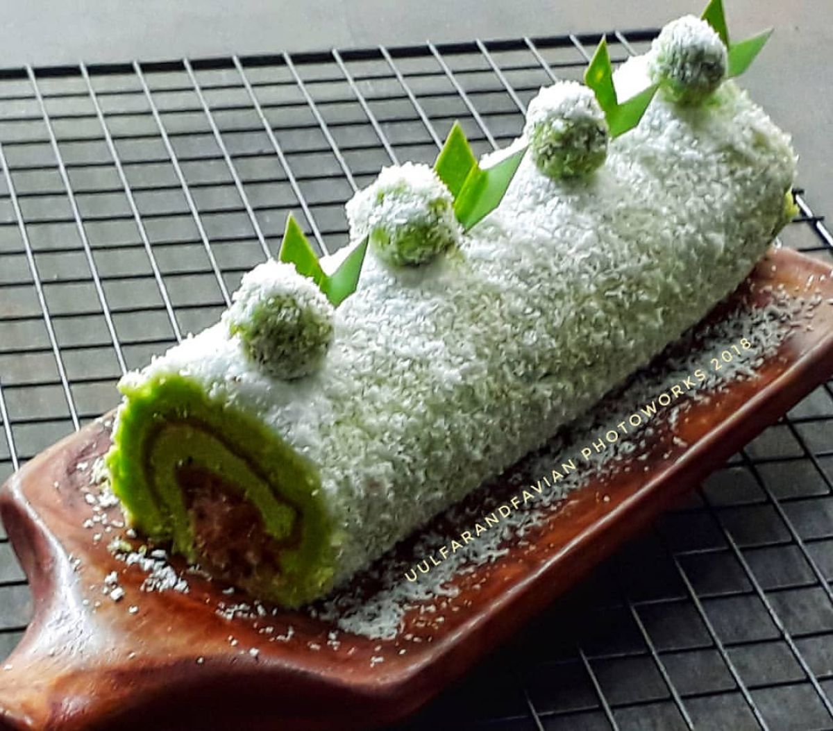- Olesi permukaan gulungan bolu dengan sisa whipping cream pandan, lalu taburi dengan kelapa parut. Hiasi dengan klepon di atasnya.