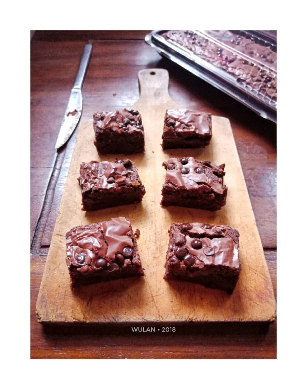 - Panggang dalam oven yang sudah dipanaskan pada suhu 155°C selama 30 menit. Periksa kematangan dengan tusuk gigi. Jika keluar sedikit remah lembab, itu tandanya brownies sudah siap!