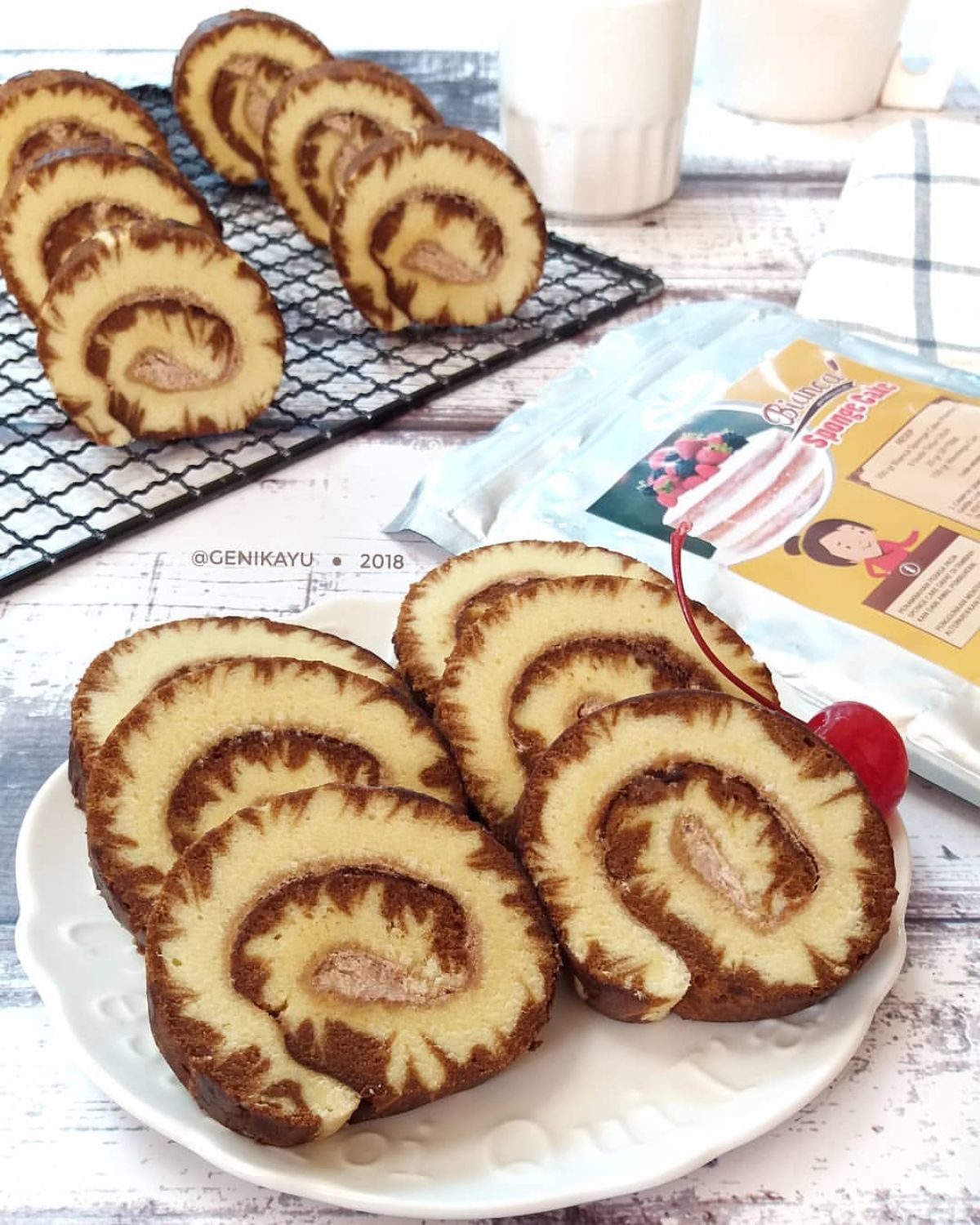 - Setelah diolesi cream, gulung kue perlahan-lahan agar tidak pecah. Potong kue menjadi beberapa bagian untuk disajikan.